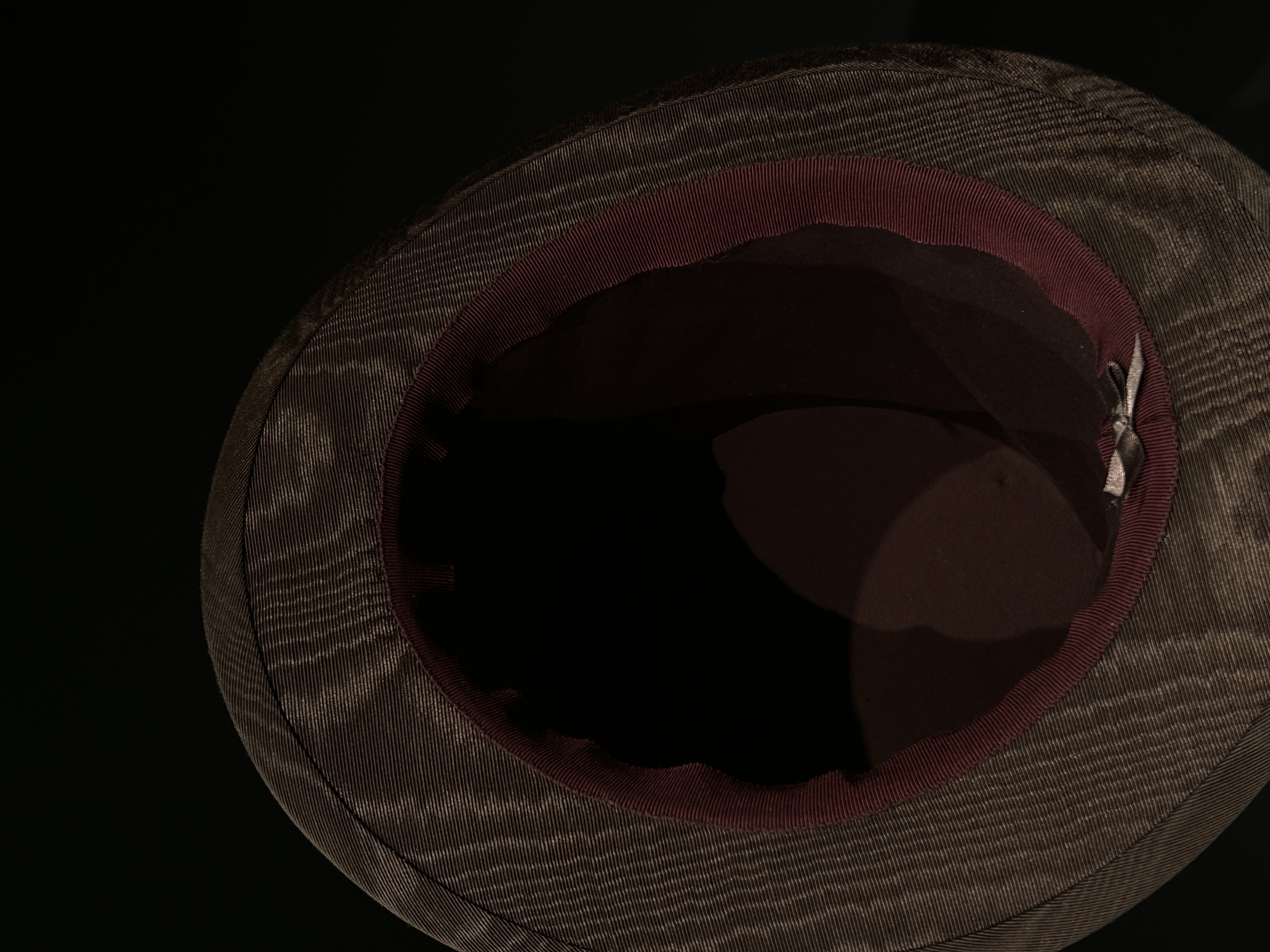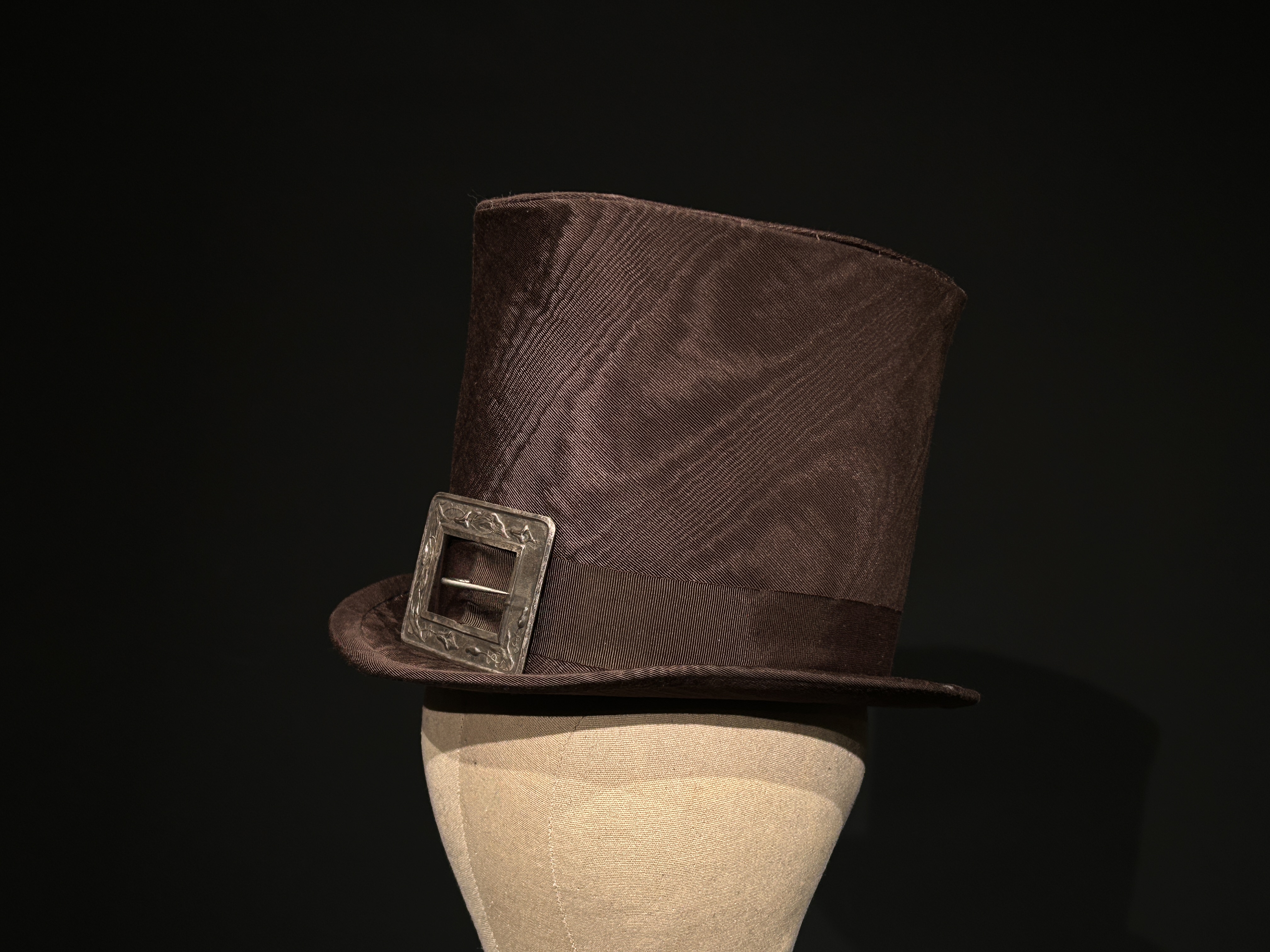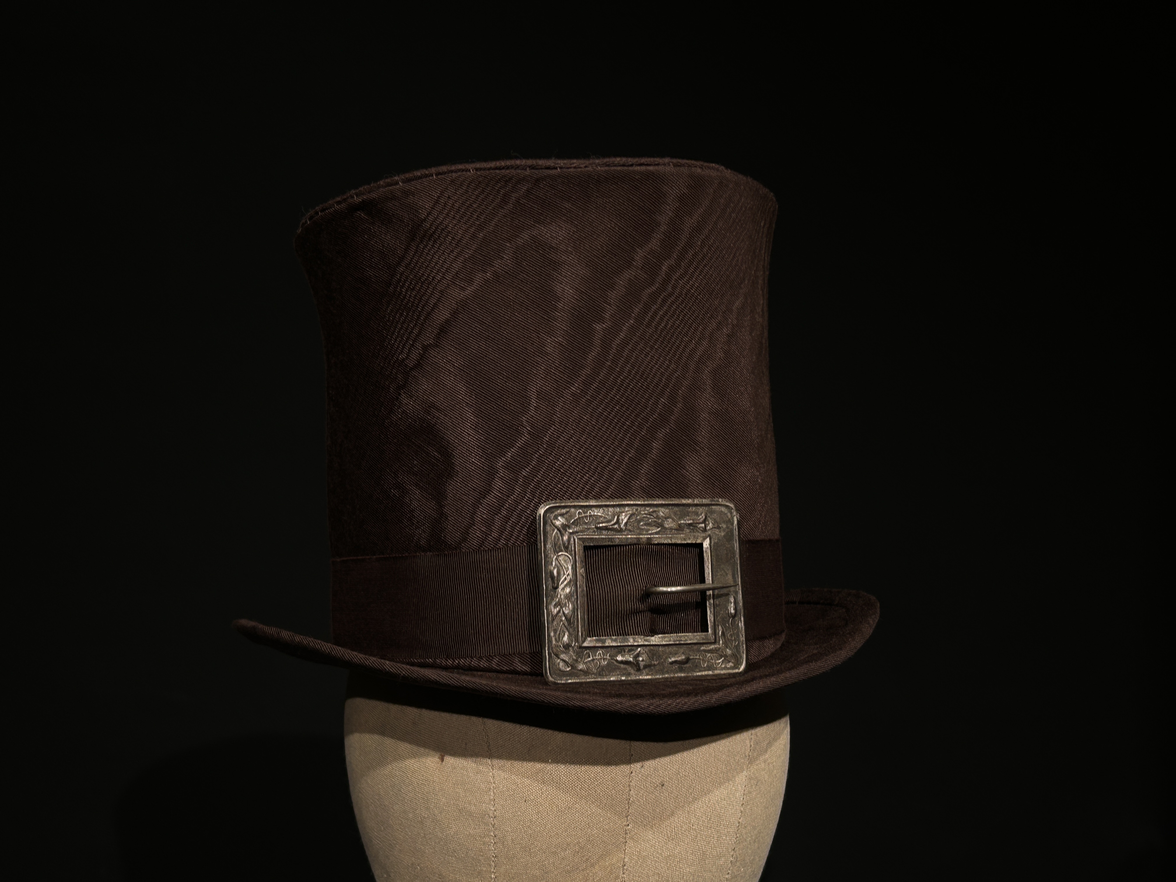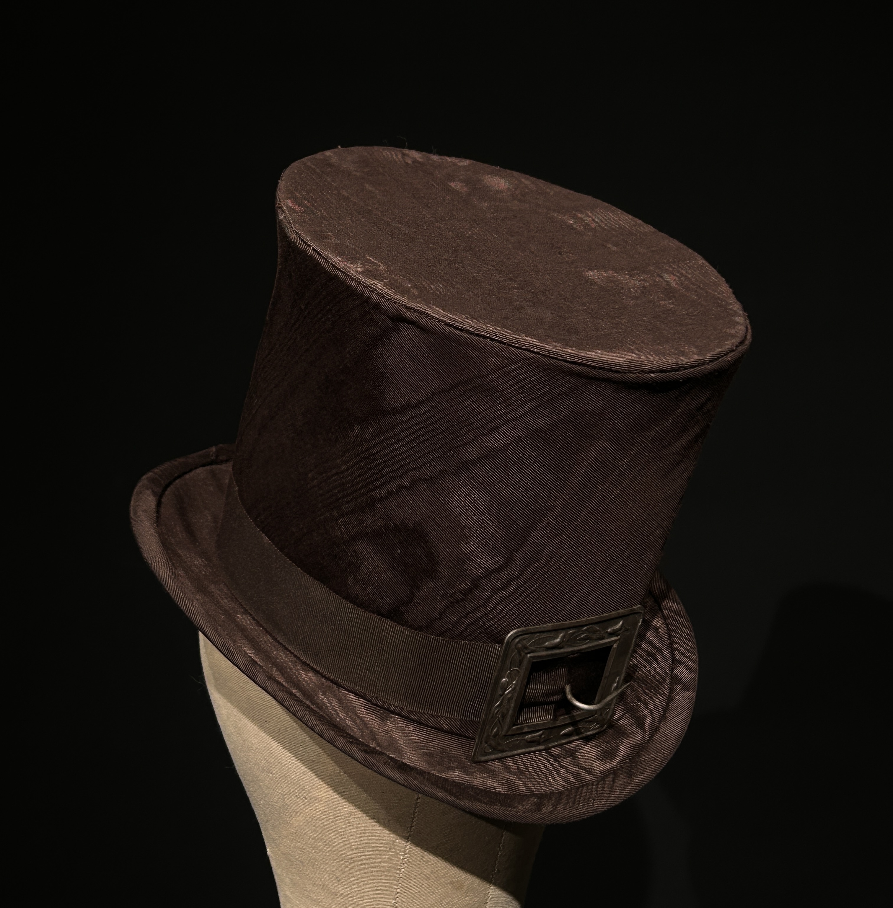 Double laminated buckram frame with moire fabric cover, petersham ribbon, and vintage buckle.